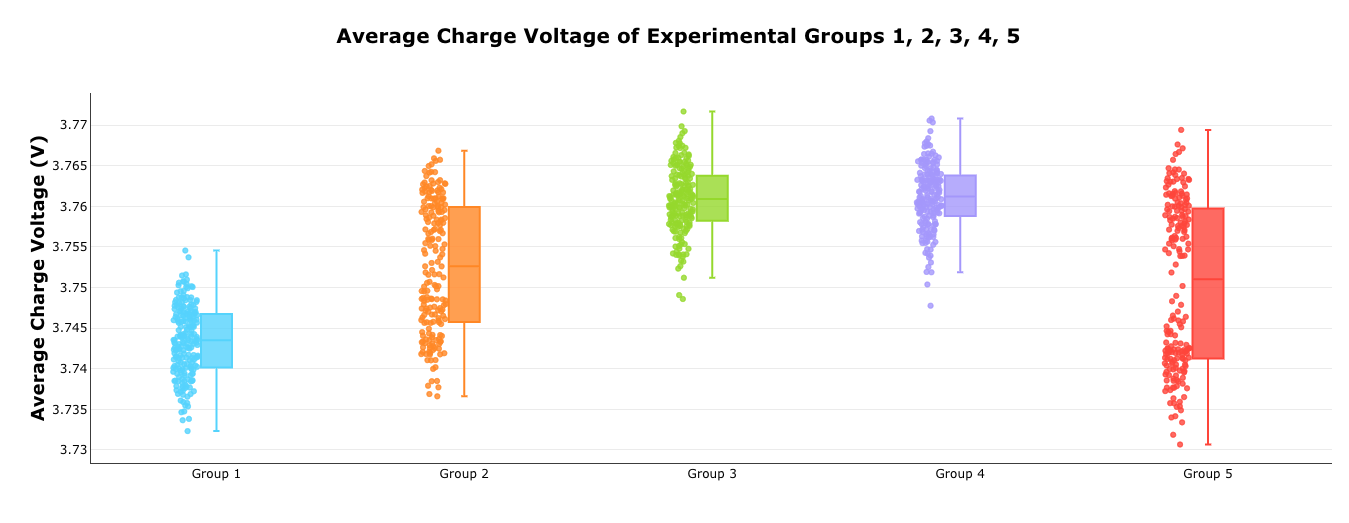 Suppose your team is trying to figure out how thickness variation affects charge voltage. The common way to investigate this is to conduct an experiment that measures the charge voltage at various thickness levels. If five different thicknesses are being tested, they might be labeled experimental groups 1, 2, 3, 4, and 5. Plotting this experiment in Voltaiq might look something like this:
